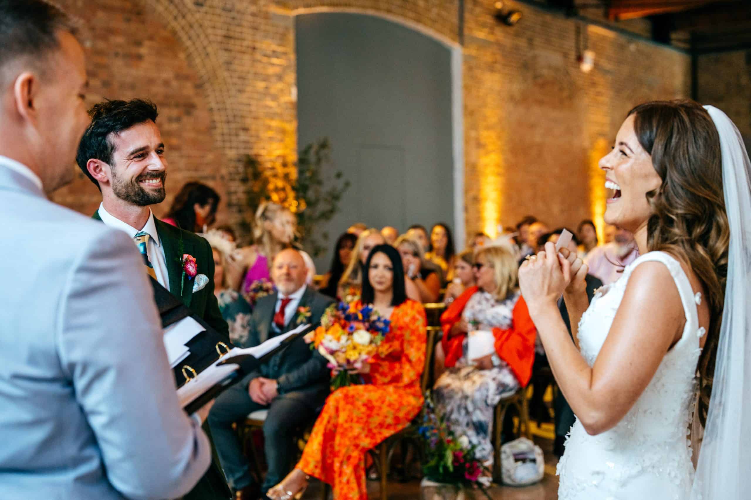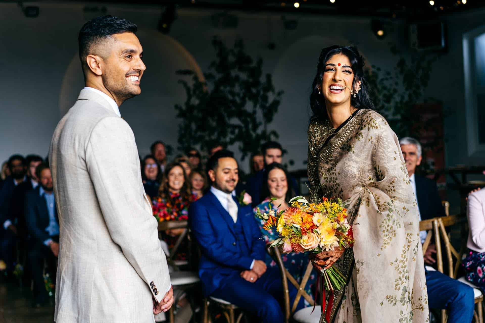 Bride and Groom share a cheeky grin whilst holding hands during their civil ceremony at Trinity Buoy Wharf.