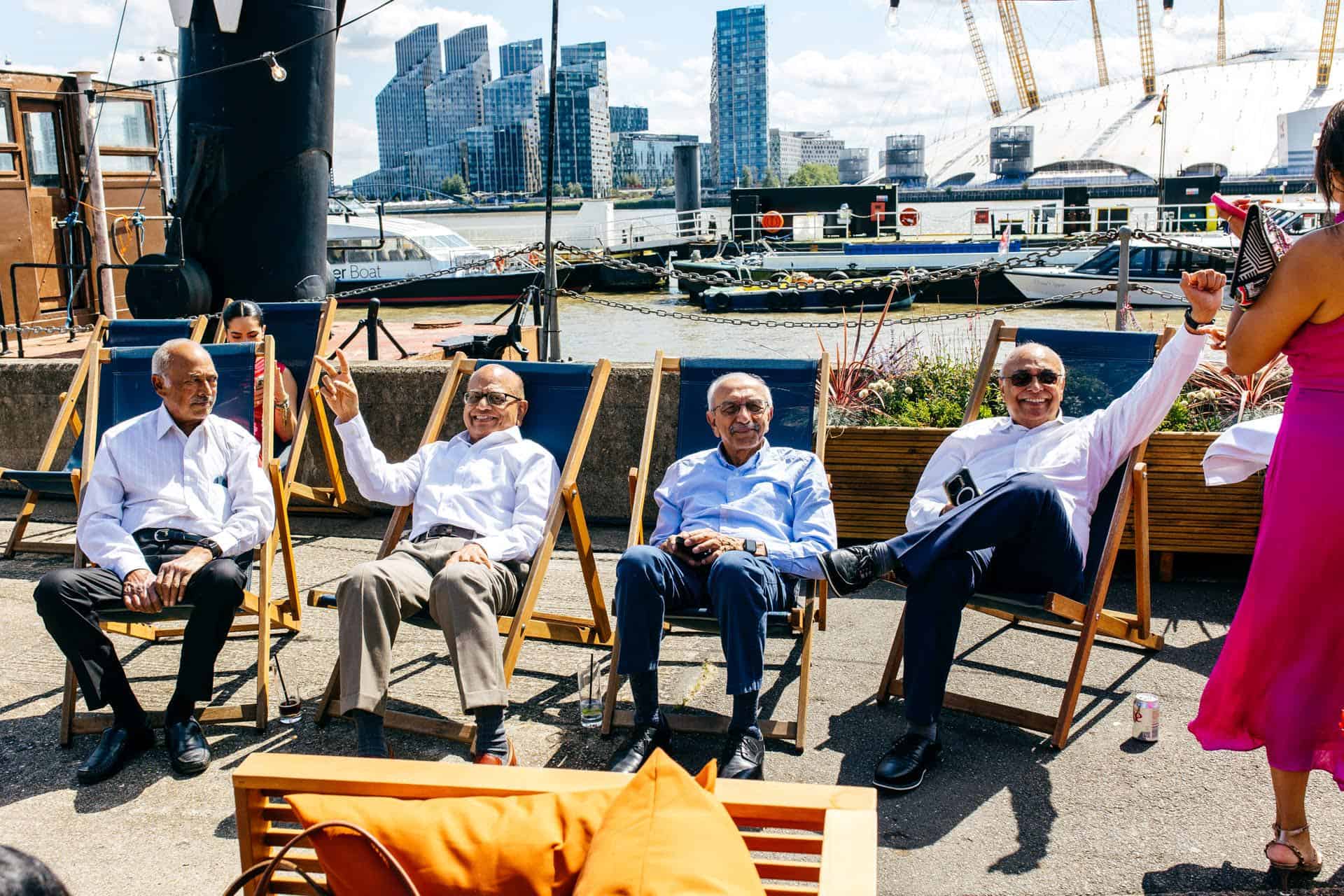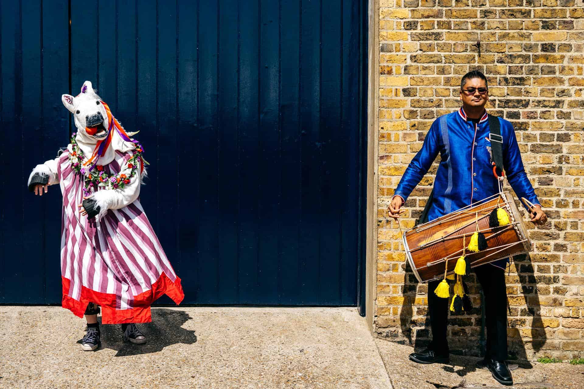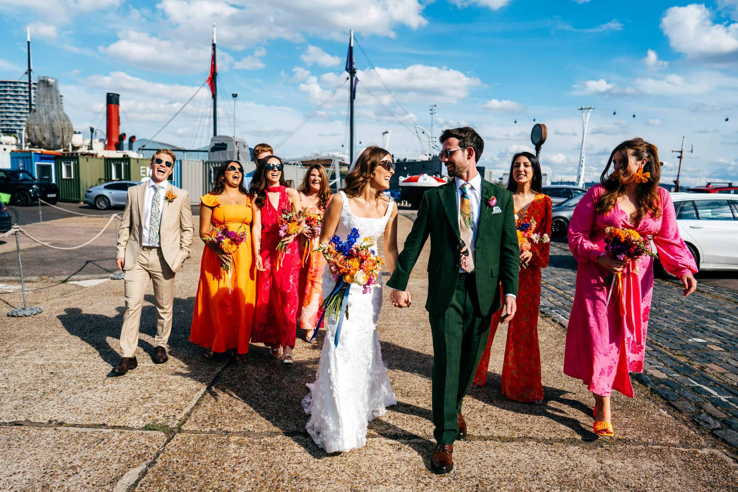 Couple disembark boat at Trinity Buoy Wharf ahead of their Humanist Ceremony. Couple and crowd dancing to dhol drummers