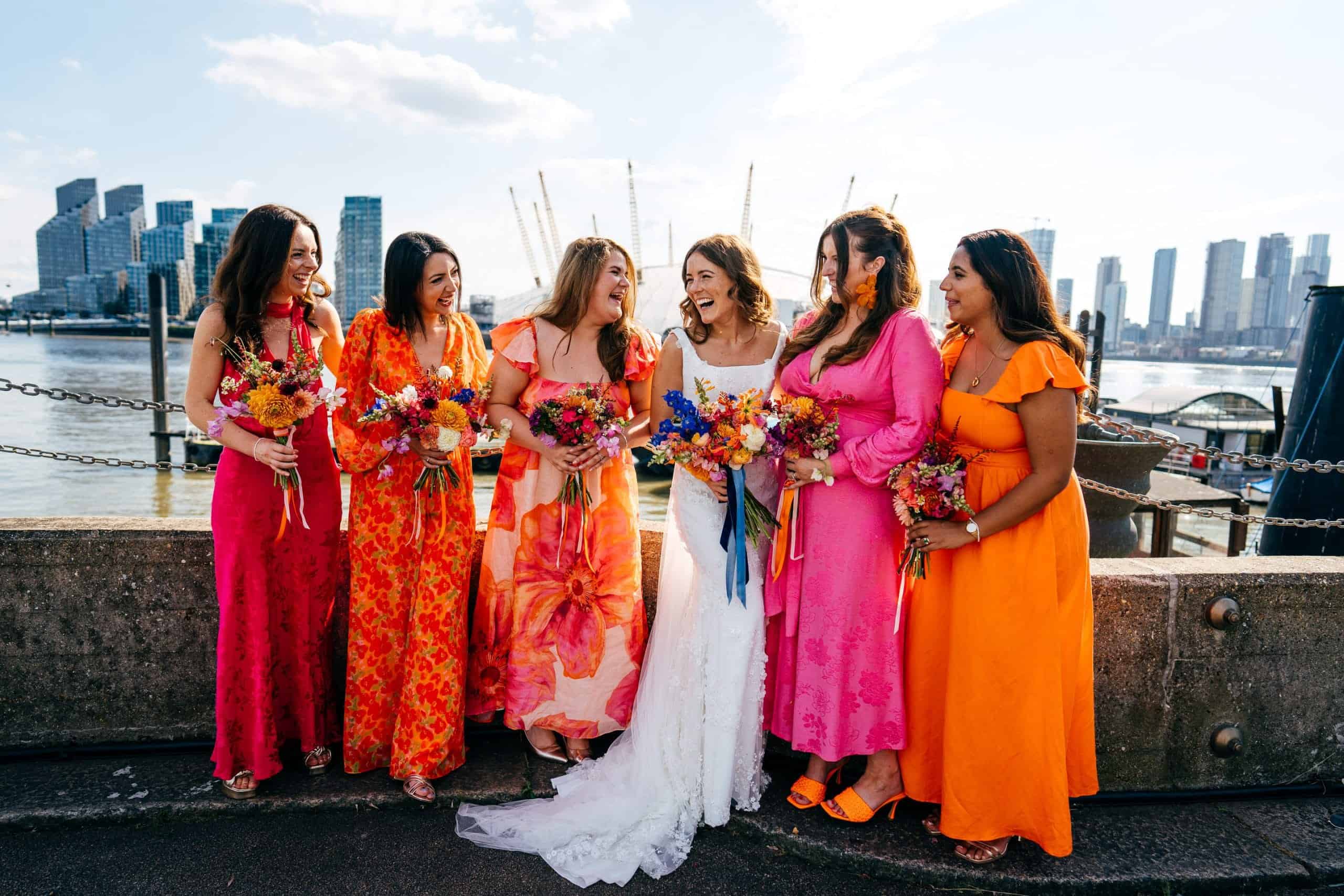Bridal party shot in front of the lighthouse at Trinity Buoy Wharf. Bridal party wear sunglasses and shades of orange and pink.